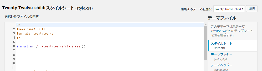 「テーマの編集」をクリックしますと子テーマのスタイルシート(style.css)が表示されているはずです。