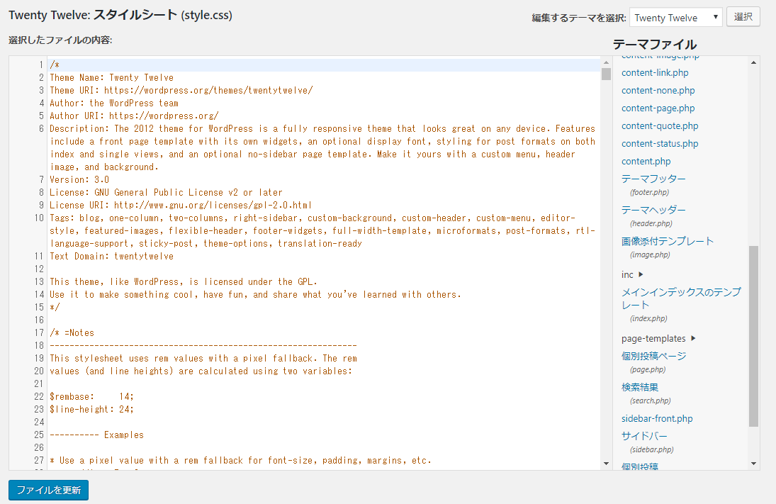 「外観」の「テーマの編集」をクリックしますと、「Twenty Twelve: スタイルシート (style.css)」が表示されましたね。