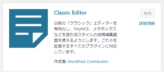 「プラグイン」の「インストール済みプラグイン」をクリックしますと、Classic Editorが追加されています。